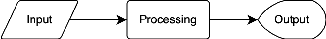 As programmers, we often produce diagrams to help us visualize the requirements that our programs need to fulfill. We can start with an elementary diagram of the general concept of Input ⇨ Processing ⇨ Output like this: